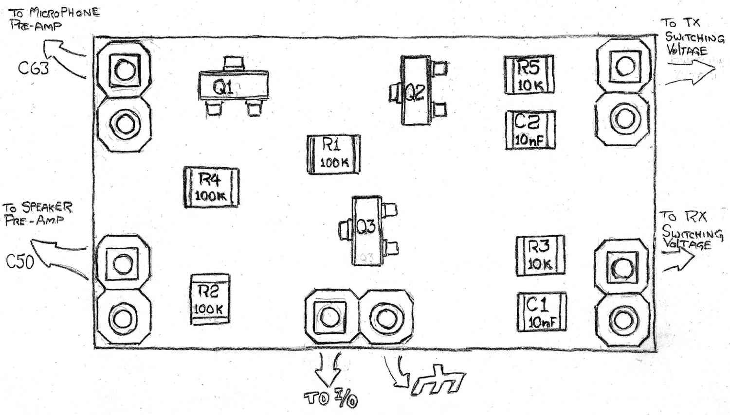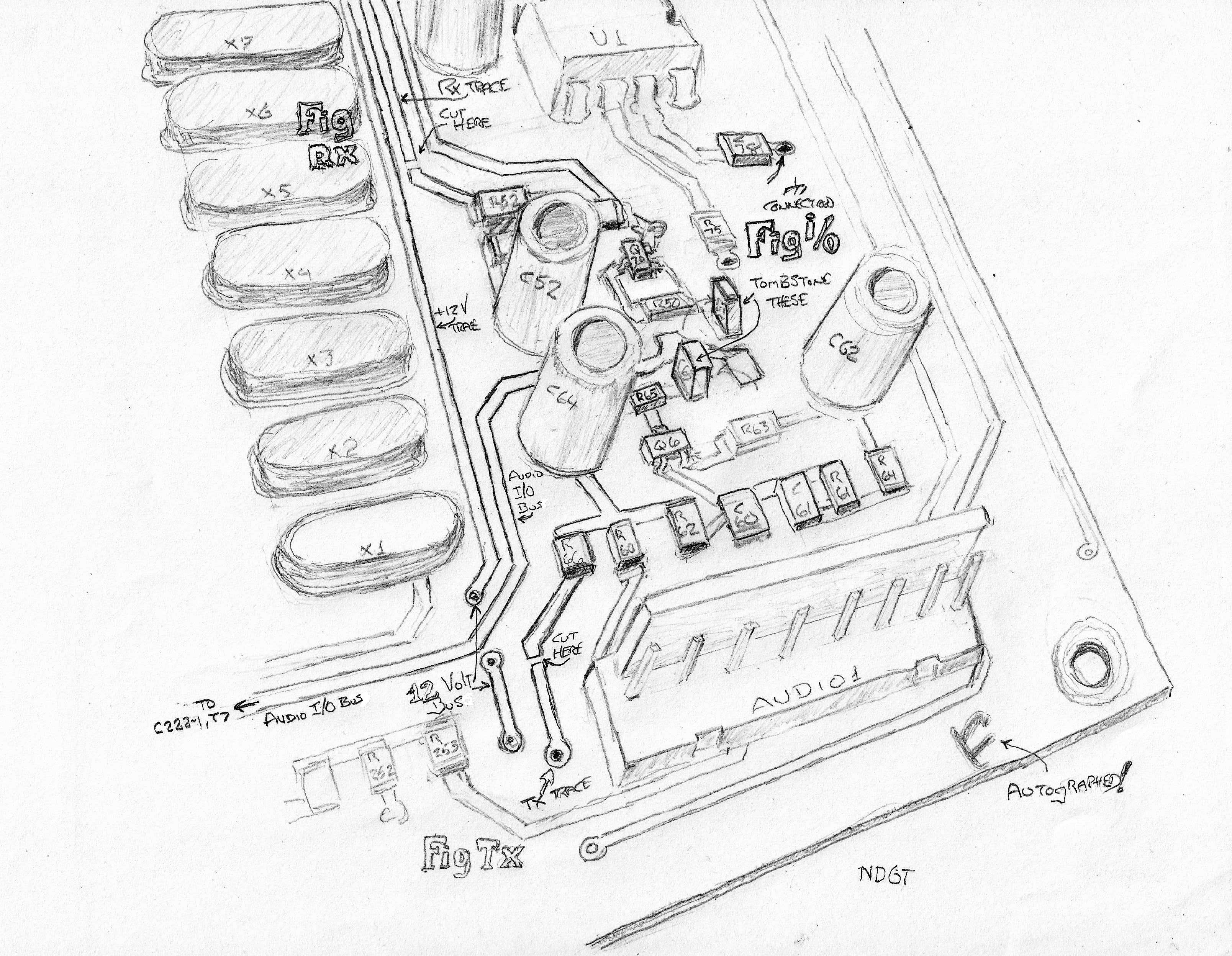 Locate capacitor C50 shown in Figure i/o. Desolder it and gently remove it. Stand it on end on the pad leading to R50 and solder it in place. The exposed end of this capacitor will be where the receive pre-amplifier will be connected from the "C50" pad on the new kit board.
