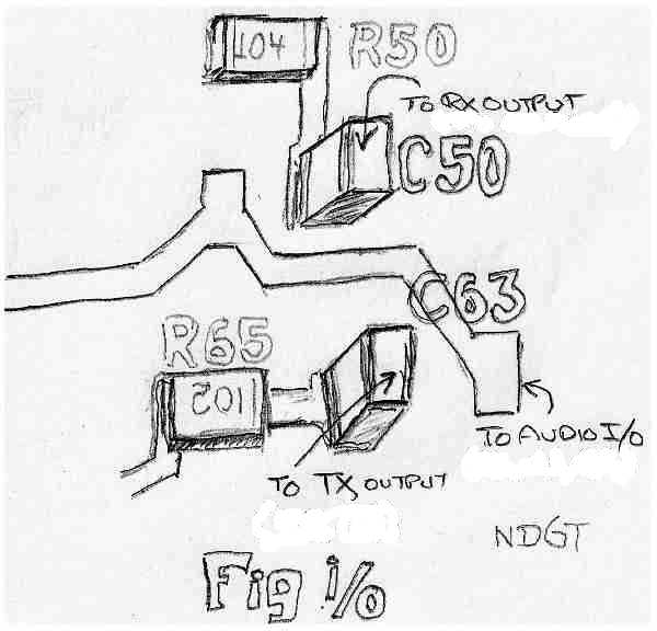 Locate capacitor C63 nearby, remove it, and solder it on end to the pad leading to R65. The exposed end will be where the microphone pre-amplifier will feed the new kit board at the "C63" point.
